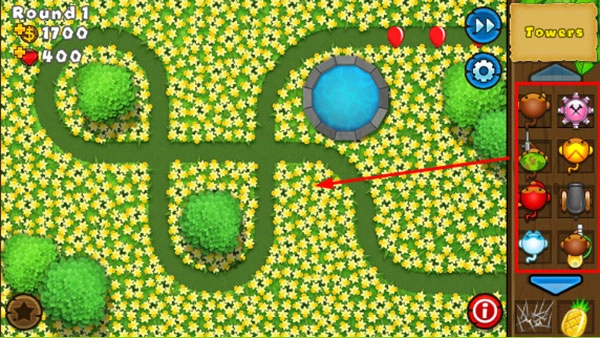 挑选攻击力强的炮塔,安置在恰当的位置,阻拦气球抵达终点。