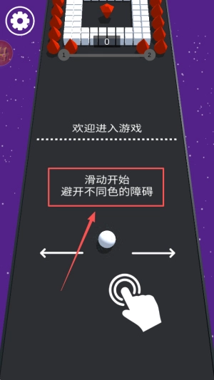 阅读指引:在显示“欢迎进入游戏 滑动开始 避开不同色的障碍”的界面进行滑动操作以开始游戏。