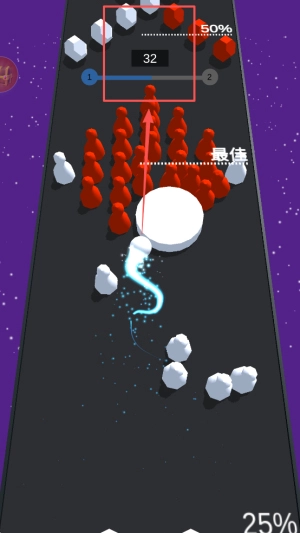 持续躲避:在显示“50% 32 250”的界面上左右滑动,避开颜色不同的障碍,推进并完成进度。