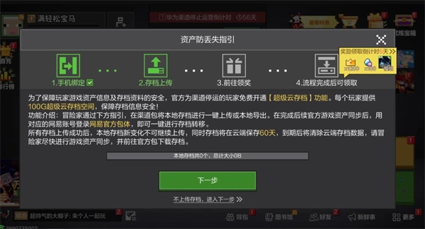 绑定手机号后,系统会自动启动存档上传流程,请耐心等待云存档操作完成。为保障渠道停运玩家的游戏资产与存档资料安全,游戏将为这类玩家免费开通超级云存档功能,每位玩家可获得100G的超级云存档空间,确保存档信息安全存储。玩家可按照指引,在渠道包内对本地存档执行一键上传或本地导出操作。待后续完成游戏资产同步后,使用对应的网易账号登录《我的世界》官方服务器,即可一键完成存档转移。需要注意的是,所有存档上传成功后,本地存档的新变化将无法继续上传;同时,云端存档仅保留60天,到期后数据将被清除,请各位冒险家尽快完成游戏资产同步。