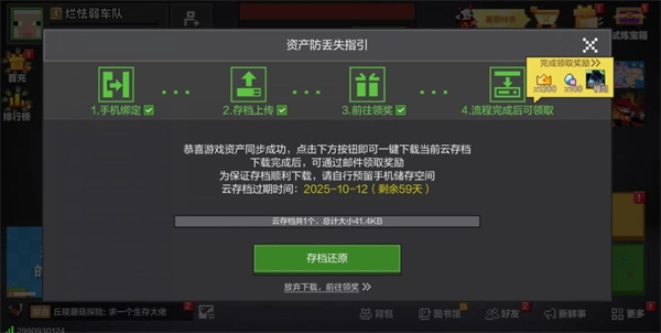 提示成功找回后,就可以登录官方服务器的游戏,点击首页中间顶部的按钮来进行存档还原操作,这样就能完成数据同步了。