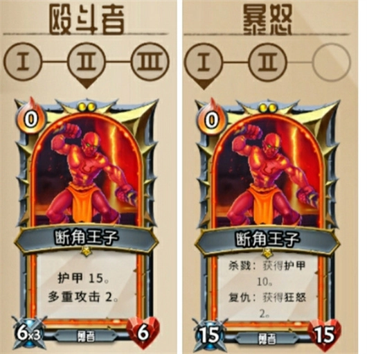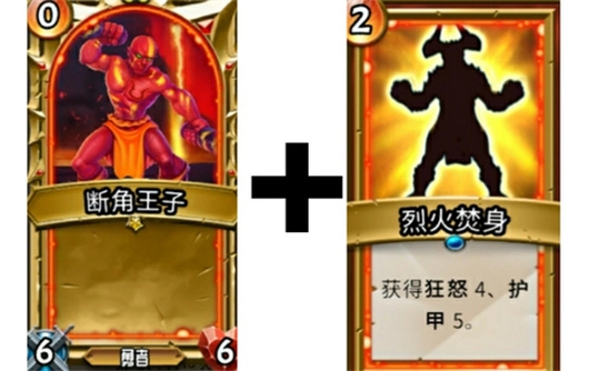 这段文本的核心是“断角王子”与“烈火焚身”这两个元素。作为勇者卡的“断角王子”,升级需要Ⅱ级“殴斗者”和Ⅰ级“暴怒”;而“烈火焚身”则着重强化“减费”与“返回”效果,当强化完成后,它还能复制出一张相同的卡牌。