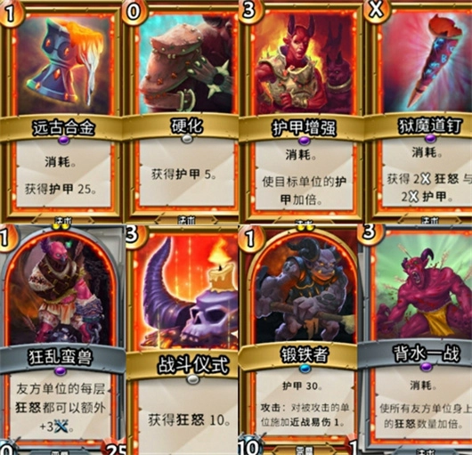 增加护甲与狂怒层数的卡牌自然无需多言,费用较低的可以叠加“双层”与“返回”效果,费用较高的则可以叠加“双层”加“冰冻”或者“减费”效果。