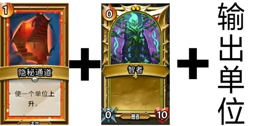 核心卡牌组合为“隐秘通道”“智者”加上若干输出单位卡。该流派的核心思路是凭借以多对少、职责清晰的超级堡垒战术来作战。