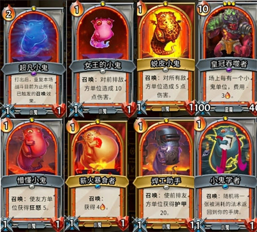 “小鬼回收”能确保每回合都有“小鬼”卡可用,“死者骨灰”可让“小鬼”卡的召唤效果额外触发一次,“女王之尾”能带来抽卡和回费的效果(不过作用比较有限),而“永恒之火”减2费后,所有“小鬼”卡都能随意打出,不会出现卡手的情况。