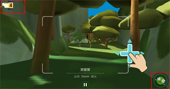 滑动屏幕能够改变相机的朝向,左上角会显示胶卷的剩余数量,点击右下角红框里的按钮,就能给动物拍摄照片,在这个场景中还能听到各种各样动物的叫声。