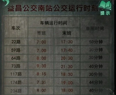 下车后借着车灯总算能看清时刻表了,这里我们要重点记录的就是末班车到站的时间——简单算一下就能知道:22路是18:20,59路18:10,64路21:00,73路22:10,117路19:00,174路19:44,204路18:40。虽然暂时还不清楚这些信息有什么用途,但先记录下来再说。
