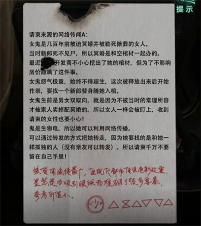 密码第三个确实模糊不清,其余的分别是缢(暗指新娘上吊身亡)、伥(为虎作伥的意思大家都明白)、这个实在看不清就空着、焦(暗示突发大火将一切烧焦)、娚(暗示新娘的性取向)、颤(颤抖吧,凡人),这些字自然是用于大小姐抱着的箱子上。调整好后箱子打开了,可纸人立刻就用手捂住了箱子。
