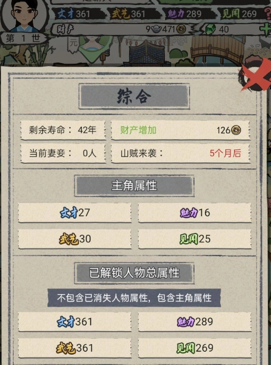 关于属性方面:文武这两项就不用多提了;魅力值可以通过参加诗会来提升;见闻值则需要外出活动获取,要是带上家眷一起去,能增加得更多。另外还有各类突发事件,文才、武力、魅力、见闻相关的都有可能遇到,具体能提升多少就得看运气了。
