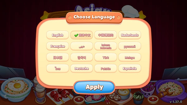 进入游戏后,第一步需要先选择游戏语言,选好简体中文后点击Apply按钮就可以了。