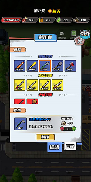 进入游戏后,在屏幕任意位置拖动就能操控角色移动,当角色靠近敌人时会自动发起攻击。屏幕上方从左至右依次显示角色的血条、食物剩余量、子弹储备数、拥有的金钱以及材料;点击切换按钮可以更换武器。游戏里角色每天都会消耗食物,材料能用来制作武器,金钱则可用于角色升级。由于前期弹药比较匮乏,建议优先使用棒球棍这类近战武器。