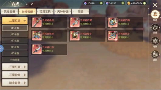 4、女性装备合成规则:仅限性别为女性的职业装备参与合成,具体合成路径为:橙色2星装备可合成红色2星装备,红色3星装备可合成粉色3星装备,粉色3星装备可合成粉色4星装备,粉色4星装备可合成幻彩5星装备。