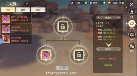 2、合成系统是游戏内的基础系统之一,整合了碎片合成、道具等级提升、道具星级提升、道具品阶提升等功能,涵盖装备合成、圣饰合成、特殊道具合成及道具合成模块。考虑到装备合成的规则,建议将魔王掉落的橙色2星及红2星以上装备留存,红1星装备则可在龙神界面进行消耗处理。
