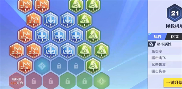 4、铭文方面,游戏内设有铭文系统,玩家点击备战选项即可进行铭文搭配。游戏中的铭文与王者类似,同样分为三类,玩家能够依据不同角色来搭配合适的铭文。铭文槽可通过格斗积累熟练度来解锁,铭文升级的方式也和王者相同,需要消耗铭文碎片,而铭文碎片可以通过完成格斗任务和开启宝箱来获取。