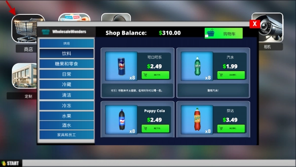 3、进入超市后,初始场景是空荡荡的,首先需要进货。点击右上角的金钱图标,再点击商店就能开始采购,刚开始选些银两和零食就可以了。