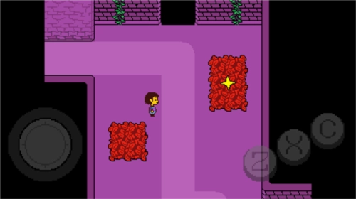 2、跟着Toriel走到遗迹入口,花丛里会碰到第一个保存点(星星)。Toriel直接告诉你这里就是你的新家。进入第一个存档点北边的房间,Toriel会亲自解开这个房间的谜题,所以直接穿过北边的门就行。接着进入东西走向、有两条小溪的长廊,Toriel会让你拉下墙上带标记的杆子,总共要拉两个,这样东面的尖刺陷阱就会消失。