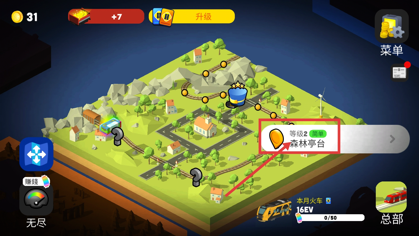 1、点击【等级2-简单-森林亭台】进入关卡,开启火车运输乘客的任务,在此过程中可查看升级、菜单功能,熟悉界面后继续推进关卡。