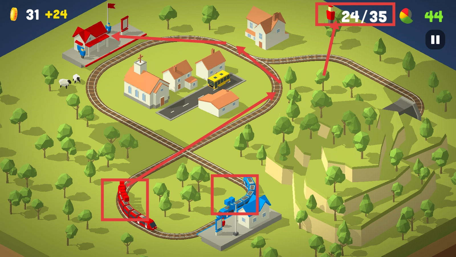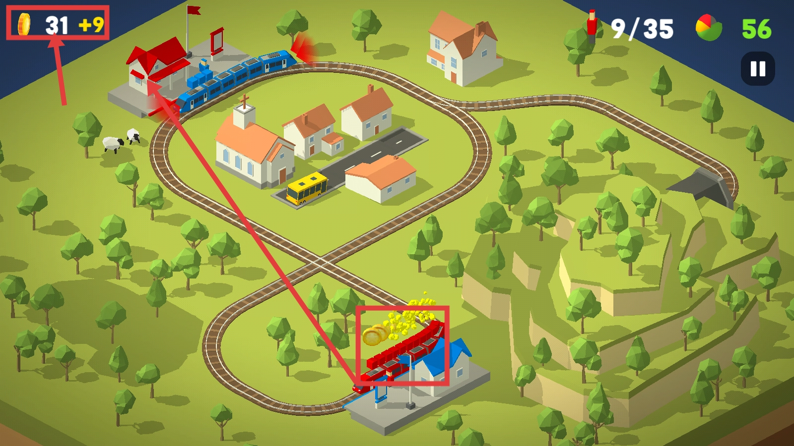 2、控制蓝色与红色的火车,前往各自对应的车站接送乘客,积累总计【31+9】的金币,着手达成运输次数的目标。