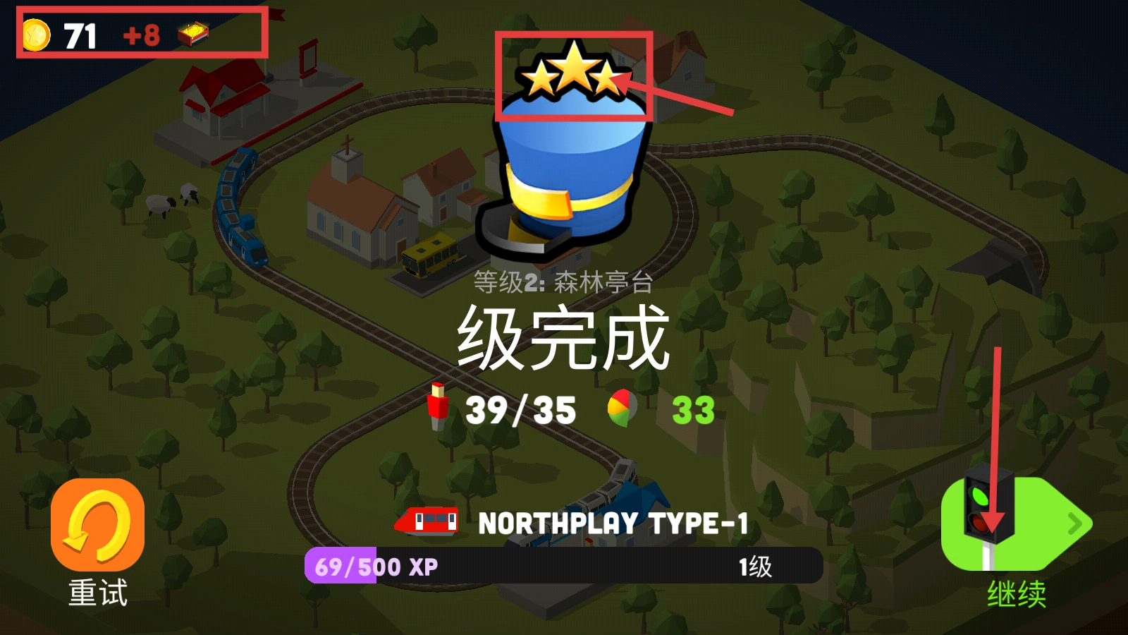 4、完成关卡后,可获得【金币71+8】以及三星评价,点击【继续】按钮就能进入下一关,通过积累资源来升级火车。