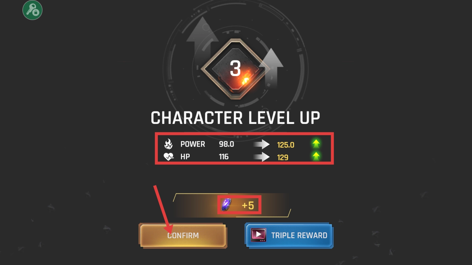 4、角色【CHARACTER-LEVEL-UP】升级后,属性【POWER】与【HP】会随之提升,同时可获得对应奖励,点击【CONFIRM】按钮即可继续流程,后续可通过积累资源进一步助力角色升级。