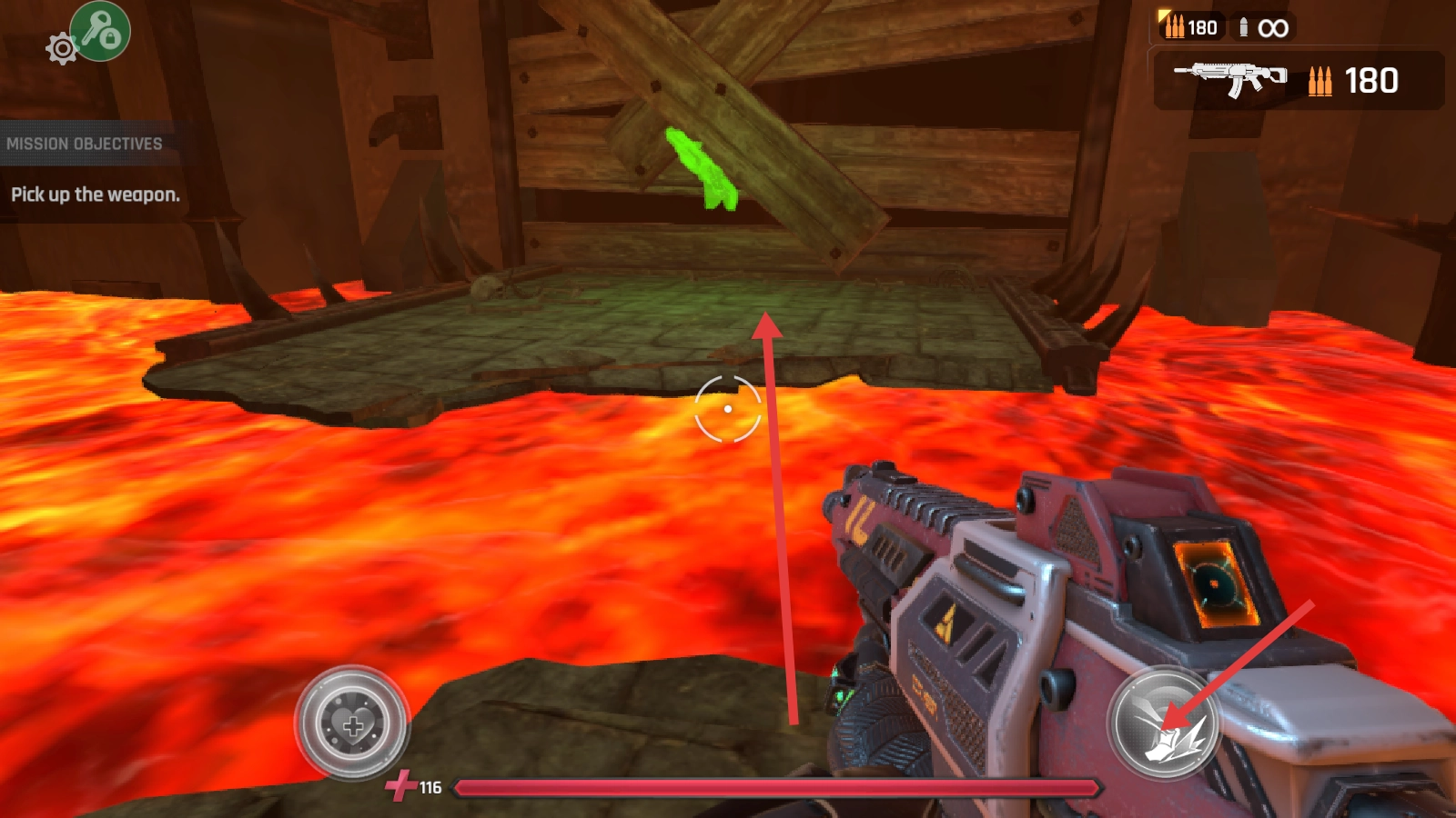 3、按照【Pick-up-the-weapon】任务要求,拾取带有绿色标识的新武器,并通过武器技能按钮来增强战斗能力。