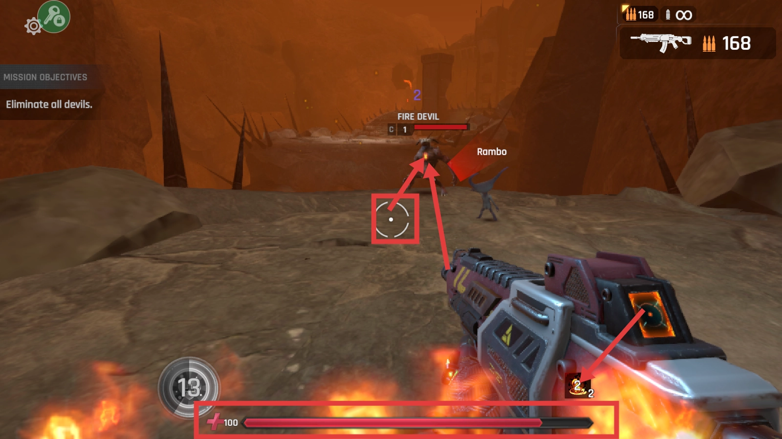 2、战斗过程中请瞄准【FIRE-DEVIL】,务必将生命值维持在【100】,同时注意观察右上角的武器弹药剩余量,通过合理控制射击节奏来消灭恶魔。