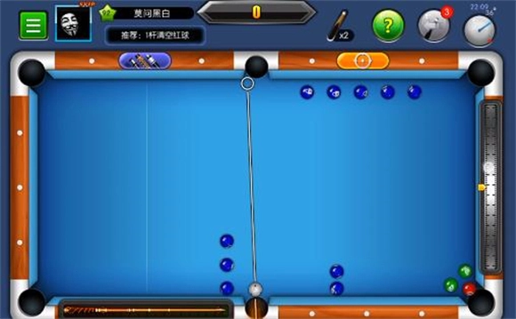 6、对准最下方的那个红球,让瞄准线紧贴着最上方红球的右侧边缘,然后用最大的力量击球就行。