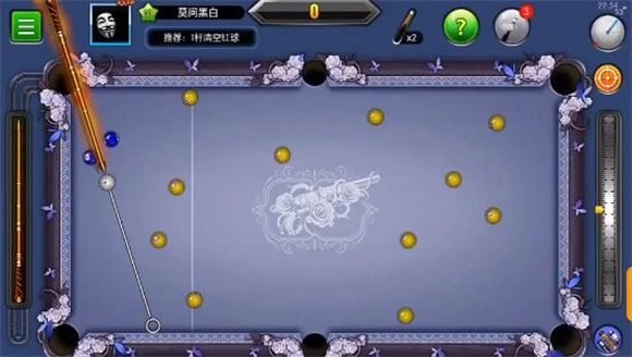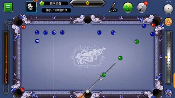 6、开局时把目标对准最右侧的蓝球,接着选择右塞,以25度的角度扎出弧线球,将力度调至最大就行。不同球杆的特性有差异,需要根据实际情况做出相应调整,这一点你自己尝试几次就能掌握了。