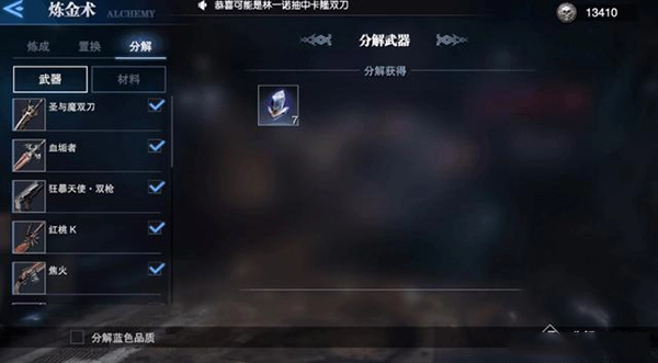 重复获取的武器会自动分解,对于不再需要的武器,也能借助炼金术系统进行手动分解。