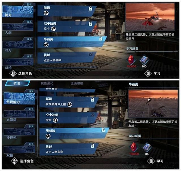 另外,能力界面里有个“华丽流”技能选项。开启这个功能后,战斗时就能携带两把主武器,还能自由切换,这样就能打出更丰富的连招组合了。(华丽流里的武器同样属于专属系统)