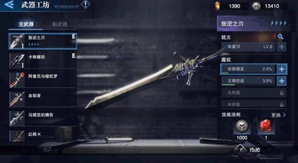 武器工坊具备三项核心功能,分别是铭文升级、魔纹洗练与附魔加成。