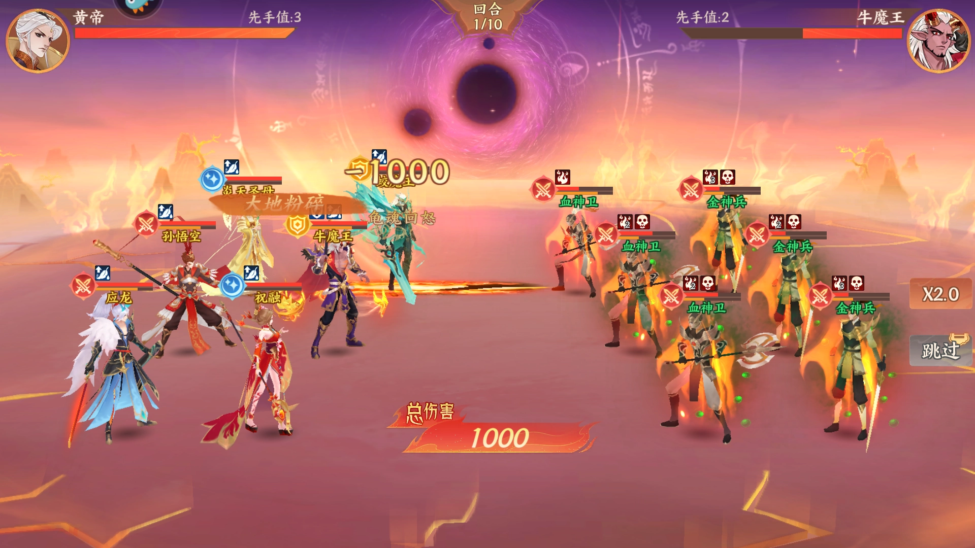 【组队策略】:牛魔王承担群体控制职责,雷震子通过快速压低敌方血线并持续攻击达成点杀目标,祝融负责叠加灼烧状态,应龙则引爆伤害完成最终收割。