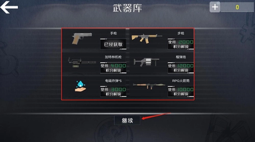 2、在武器库中选择你的武器,点击继续;