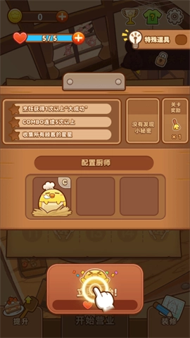 进入游戏界面后,获取星星的条件、厨师的相关信息以及各类奖励都清晰可见,确认没有问题后就可以马上开始营业了。