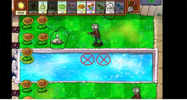 1、首先是前期,前几轮一定要多种向日葵积攒阳光。然后用土豆地雷来拖延时间,到有足够阳光种猫尾草时,就种猫尾草(记得加上南瓜头)水池中就种两个即可,因为猫尾草伤害尚可,攻速又快,还可以攻击全图的僵尸,是对付前期僵尸的“好东西”(这里注意一下,猫尾草在水池中只需种两个是为了后期防止气球僵尸的入侵,不要种太多占地方,水池里的僵尸非常局限,种类不多,所以要充分利用好水池,图片中画红色叉号的地方就是种猫尾草的地方。):