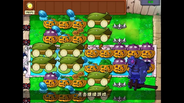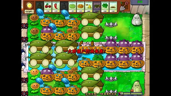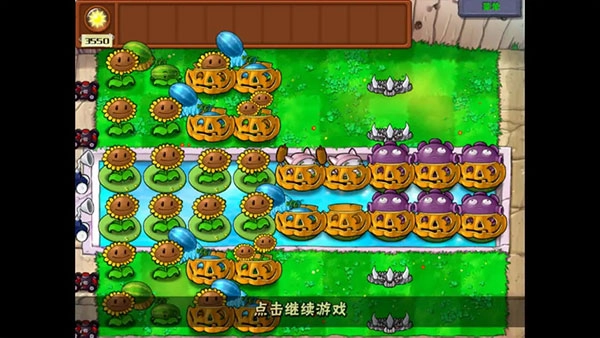 3、当打到第5、6面旗帜时,就可以开始部署“炮”了(需要注意的是,玉米加农炮不能用南瓜头来保护,而且要种玉米加农炮的玉米投手位置也不能种南瓜头。):
