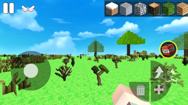 2、点击屏幕添加不同类型方块,从基础建材到生态元素,自由搭建小木屋、道路等各类建筑与设施。