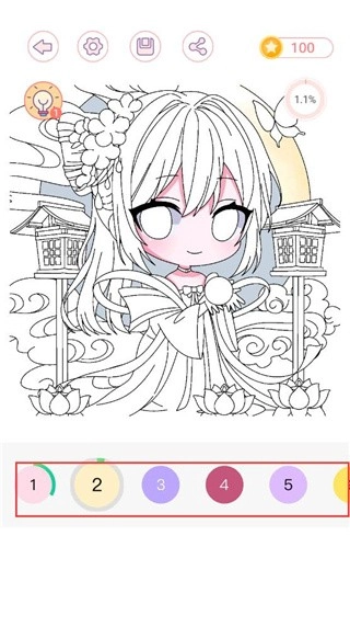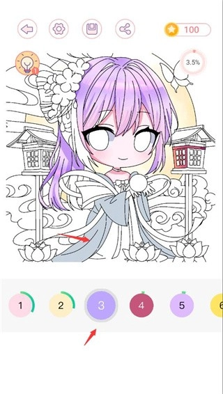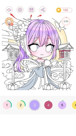 点击箭头样式的图标就能回到上一步,第三个图标可以把当前的涂色状态存下来,第四个图标则能让你把作品分享给身边的伙伴。