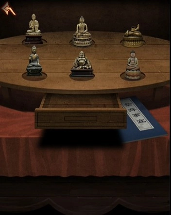 点击位于正中央的桌案,完成游戏后拉开抽屉,即可获取「长寿符」与「木制机关」这两件物品。