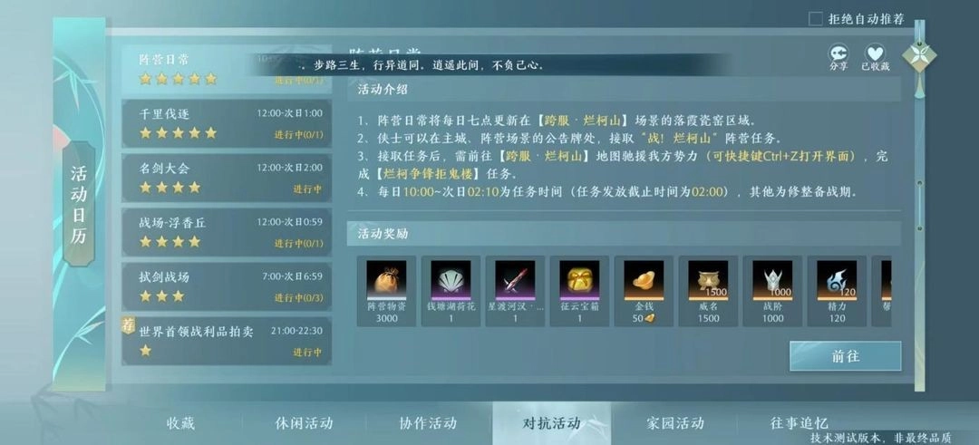 其中【阵营日常】【千里伐逐】和【战场】都属于阵营任务,活动里浩气盟与恶人谷这两个阵营的玩家要展开对抗。要是你想参与,得先选择加入浩气盟或者恶人谷中的一方,之后才能接取这些任务。
