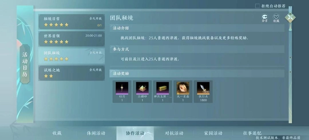 要是你是PVE玩家,不妨看看【协作活动】页面里的部分内容,像【团队秘境】和【试炼之地】这两个地方,都是获取PVE装备的好去处。要是团队里有人竞拍装备,大家还能赚些金币。