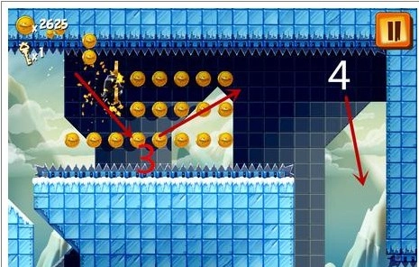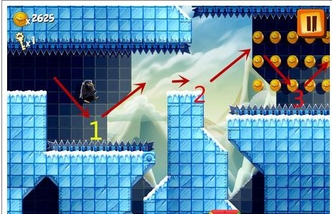 当企鹅下降到指定的1号位置时,用手指在屏幕上向上滑动,帮助企鹅跃至小平台之上。