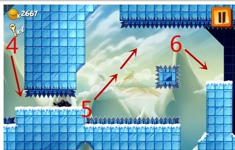 在6号小平台得提前准备好三连跳,这个动作其实没那么难:先在7号位置快速起跳,等落到8号位置时,立刻用手指在屏幕上向上滑动完成第二次跳跃就好。