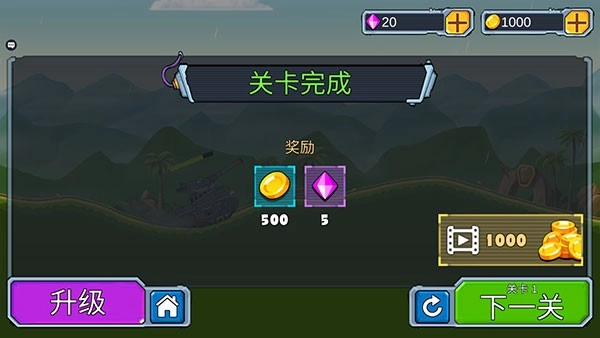 把地方的坦克都消灭干净后,就能完成升级,还能拿到金币和钻石作为奖励,这些奖励可以用来提升等级,或者直接点击“下一关”开启新的挑战。