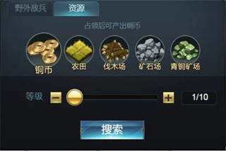 出征野外资源地能够采集相应资源,本国区域分布着1-8级资源,国战区域则有9-10级资源,其数量更为丰富。在采集过程中,队伍会驻扎于该资源地,可能会被其他玩家发起挑战。
