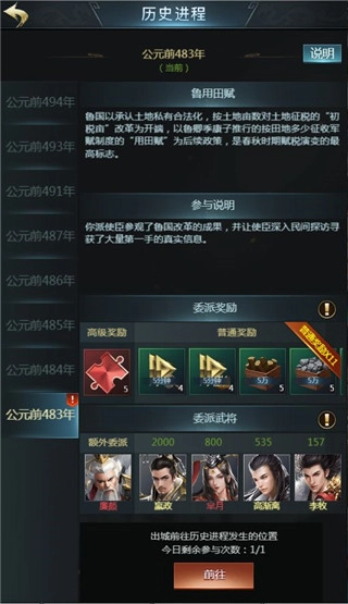 每日参与历史进程活动可领取奖励,该活动每天会呈现一个历史事件,您能够派遣武将加入其中。