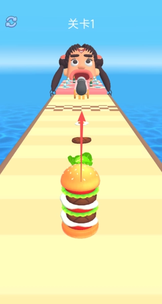 1. 起始于关卡1,在行进过程中收集食材,用以制作汉堡,完成后前往终点给客人投喂。