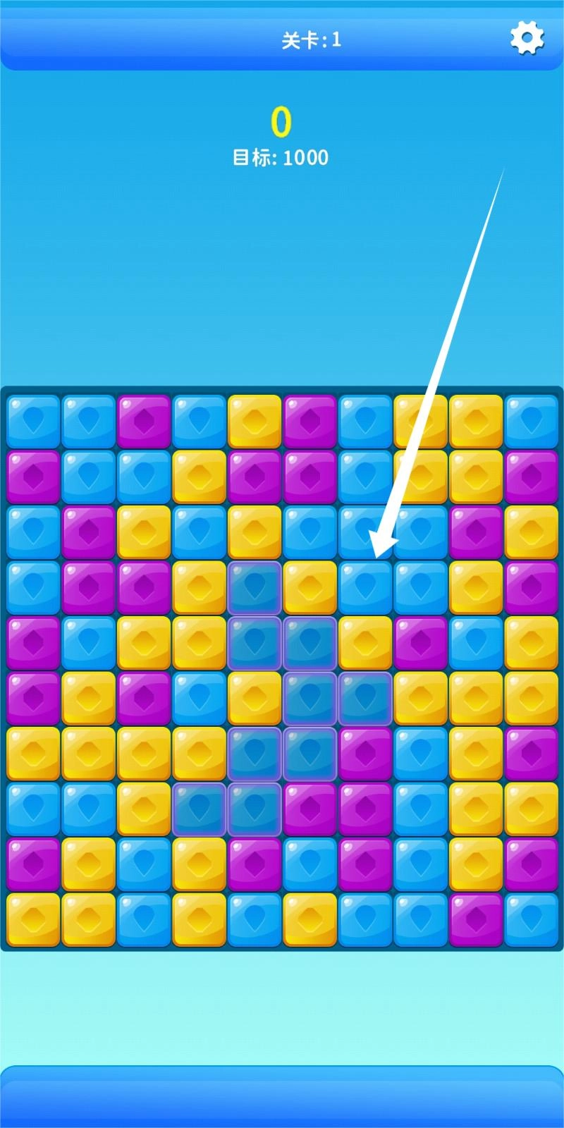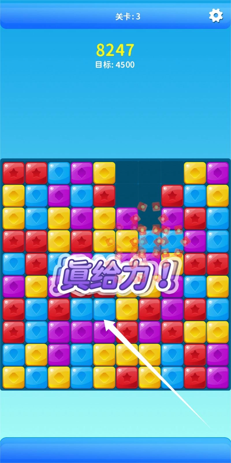 通过点击相邻且颜色相同的方块,让它们消失并积累分数,完成每一关的目标后就能继续挑战下一关。