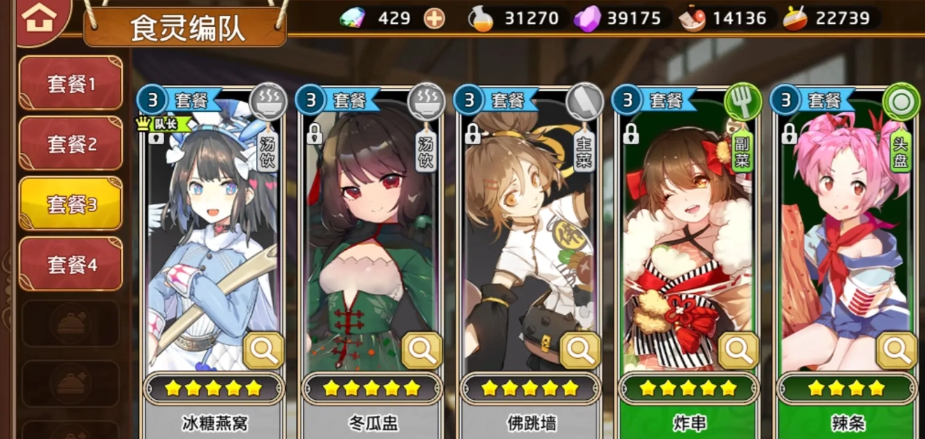第一套阵容包含鸡翅、热香饼、凉粉、冰糖燕窝和大吟酿,这是一支输出能力极强的队伍。其中冰糖燕窝在该阵容中可完成10次攻击,大吟酿不仅拥有高额攻击力,还具备不错的抗伤能力,而鸡翅能够使冰糖燕窝与大吟酿的技能费用降低2点,因此这套阵容无论在何种模式下都有着出色的战斗表现。