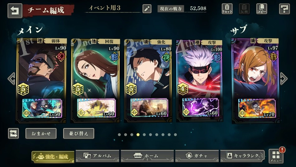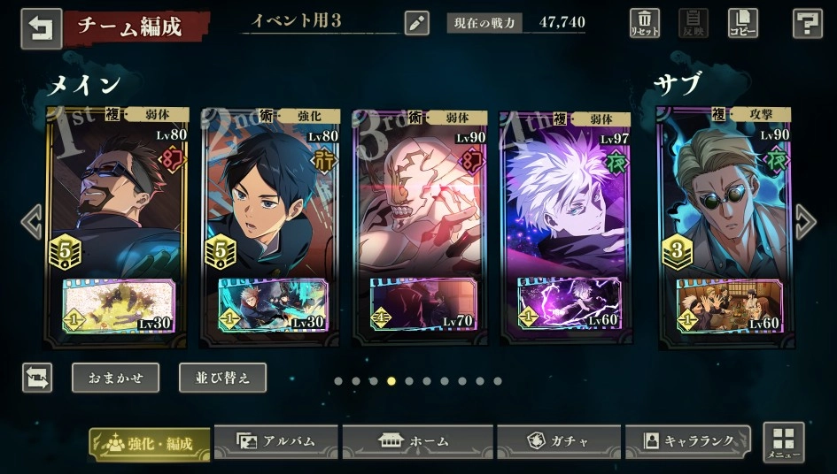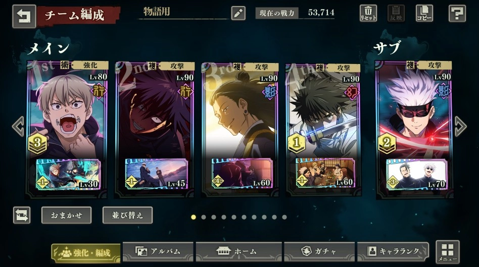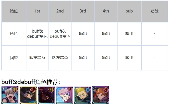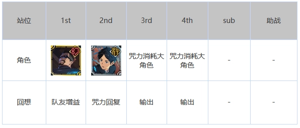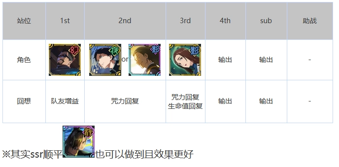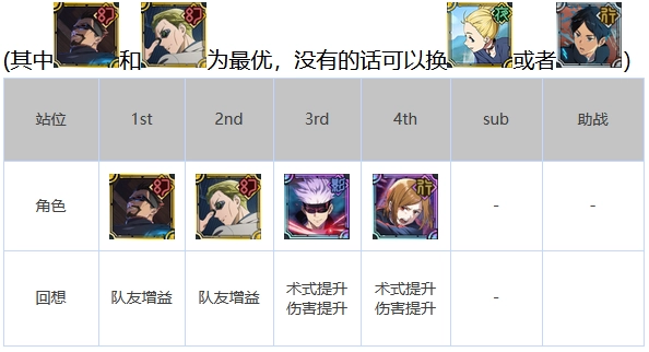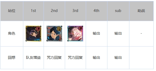 比较经典的像这类阵容,刷初始的话通常是野蔷薇搭配五条悟开局,再加上两个超泛用的增伤辅助,就是最通用的开荒队伍了,后续一些高难度副本也能派上用场。